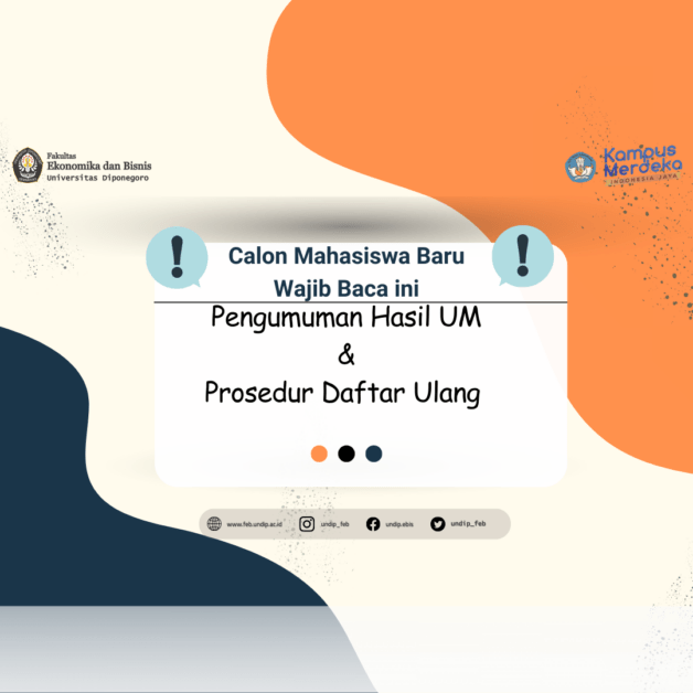 Selamat kepada Calon Mahasiswa Baru Jalur Ujian Mandiri Program Sarjana Tahun 2023 Universitas Diponegoro. Pengumuman bagi peserta yang berhasil lolos dalam Ujian Mandiri Program Sarjana tahun 2023 Undip dan registrasi online untuk calon mahasiswa baru jalur Ujian Mandiri Program Sarjana tahun 2023. Informasi Peserta lolos dan Registrasi Online melalui laman ini: REGISTRASI ADMINISTRATIF DAN VERIFIKASI JALUR UM S1 TA 2023/2024 (registrasi online mulai tanggal 6 s.d. 14 Juli 2023 pada laman https://regonline.undip.ac.id/) > (Lampiran Berkas) Pengumuman Jalur Ujian Mandiri Program Sarjana Tahun 2023 (Pengumuman UM UNDIP) Daftar Dokumen Registrasi Administratif dan Verifikasi Jalur SNBP: BIAYA STUDI UM KLIK DISINI METODE BAYAR KLIK DISINI PEMBAYARAN PEMERIKSAAN KESEHATAN KLIK DISINI PANDUAN UPLOAD BERKAS UM KLIK DISINI PANDUAN KEPESERTAAN BPJS KLIK DISINI Undip mengharapkan semua calon mahasiswa baru untuk mengikuti proses dan registrasi online dengan seksama. Pastikan Anda mengikuti semua langkah yang tercantum di atas untuk memastikan pendaftaran Anda berhasil. Selamat berjuang dan semoga sukses menjadi Mahasiswa Baru Universitas Diponegoro Tahun 2023! Sumber : Pengumuman dan Registrasi Online UM S1 Tahun 2023 – PMB Undip