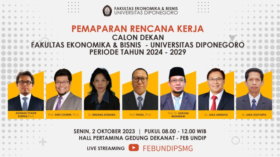 Setelah melalui proses penjaringan yang ketat, akhirnya terpilihlah 7 calon Dekan yang siap untuk memimpin FEB Undip. Ketujuh Calon Dekan FEB UNDIP untuk periode 2024-2029 akan memaparkan program kerjanya melalui kegiatan yang diadakan secara hybrid, kombinasi livestreaming YouTube (kanal : FEBUNDIPSMG) dan tatap muka di Hall Pertamina Gd Dekanat FEB UNDIP. Pendekatan ini memungkinkan akses lebih luas dan interaksi langsung dengan seluruh civitas akademika di FEB UNDIP dan pengembangan fakultas ke depan. Kegiatan ini akan dilaksanakan pada hari Senin, 02 Oktober 2023. Dikarenakan tidak semua dapat hadir secara luring, maka acara akan disiarkan juga secara langsung melalui live streaming di link berikut: https://youtube.com/live/Yy3ViwPzQqI?feature=share. Ini adalah kesempatan bagi seluruh civitas akademika FEB UNDIP untuk ikut serta dalam menentukan masa depan fakultas ini.