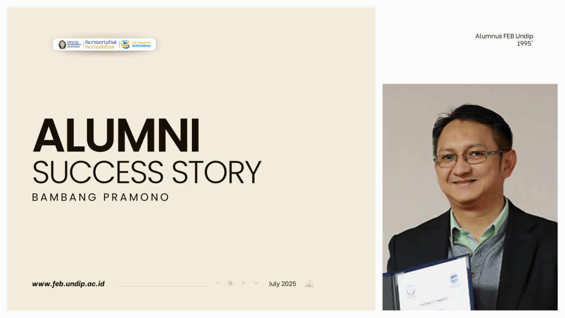 Bambang Pramono lahir di Jakarta pada 6 September 1971. Perjalanan akademiknya di bidang ekonomi dimulai di Fakultas Ekonomika dan Bisnis Universitas Diponegoro, tempat ia menyelesaikan pendidikan sarjana dan lulus pada tahun 1995. Bekal pendidikan di FEB Undip menjadi fondasi penting dalam membentuk cara berpikir analitis, profesionalisme, serta pemahaman manajerial yang kemudian mewarnai kiprah kariernya. Komitmen untuk terus mengembangkan kapasitas keilmuan membawanya menempuh pendidikan lanjutan di tingkat internasional. Bambang Pramono meraih gelar Master of Economics dari International University of Japan pada tahun 2004, kemudian menyelesaikan studi doktoral di bidang ekonomi di Nagoya University, Jepang, pada tahun 2014. Pengalaman akademik lintas negara tersebut memperkaya perspektifnya dalam memahami dinamika ekonomi global, kebijakan moneter, serta pembangunan ekonomi regional. Sejak tahun 1998, Bambang Pramono mengabdikan diri di Bank Indonesia, institusi strategis dalam menjaga stabilitas perekonomian nasional. Sepanjang kariernya, ia dipercaya mengemban berbagai posisi penting, mulai dari perumusan kebijakan hingga peran manajerial. Pengalaman panjang ini membentuk kepekaannya terhadap isu stabilitas moneter, pengendalian inflasi, serta penguatan sistem keuangan di tingkat nasional dan daerah. Sebelum menjalankan tugas di Palembang, Bambang Pramono menjabat sebagai Kepala Kantor Perwakilan Bank Indonesia Solo sejak tahun 2019. Di bawah kepemimpinannya, berbagai inisiatif penguatan ekonomi daerah berbasis UMKM dan sinergi lintas pemangku kepentingan berhasil dikembangkan. Capaian tersebut mengantarkannya dipercaya untuk memimpin Kantor Perwakilan Bank Indonesia Provinsi Sumatera Selatan sejak Agustus 2025. Sebagai pimpinan Bank Indonesia Sumatera Selatan, Bambang Pramono mengusung arah kebijakan yang menitikberatkan pada penguatan stabilitas moneter, perluasan inklusi keuangan, serta percepatan transformasi ekonomi digital. Ia juga mendorong kolaborasi erat dengan pemerintah daerah, sektor perbankan, dan lembaga keuangan lainnya guna memperluas akses pembiayaan bagi pelaku UMKM dan koperasi. Perjalanan Bambang Pramono mencerminkan nilai-nilai yang senantiasa dijunjung oleh Fakultas Ekonomika dan Bisnis Universitas Diponegoro. Dari ruang kuliah hingga peran strategis dalam perumusan kebijakan ekonomi, kiprahnya menjadi bukti bahwa kontribusi alumni FEB Undip tidak hanya diukur dari jabatan yang diraih, tetapi dari dampak nyata yang dihadirkan bagi pembangunan bangsa.