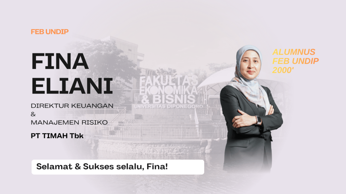 Fina Eliani, alumnus Program Studi Akuntansi Fakultas Ekonomika dan Bisnis Universitas Diponegoro, kembali menorehkan prestasi membanggakan setelah terpilih sebagai Direktur Keuangan & Manajemen Risiko PT Timah Tbk. Fina menempuh pendidikan di FEB Undip sejak tahun 2000 dan berhasil menyelesaikan studi Sarjana (S-1) pada tahun 2004. Perjalanan karier Fina mencerminkan nilai-nilai kepemimpinan, profesionalisme, dan integritas yang menjadi dasar pembentukan karakter di FEB Undip. Dengan pengalaman panjang di dunia keuangan dan manajemen risiko, ia terus menunjukkan dedikasi dalam mengelola tantangan bisnis yang kompleks dengan visi yang berorientasi pada keberlanjutan perusahaan. FEB Undip mengucapkan selamat kepada Fina Eliani atas pencapaiannya. Semoga amanah yang diemban membawa kesuksesan yang lebih besar dan menjadi inspirasi bagi generasi berikutnya untuk terus berkarya dan berkontribusi pada kemajuan bangsa.