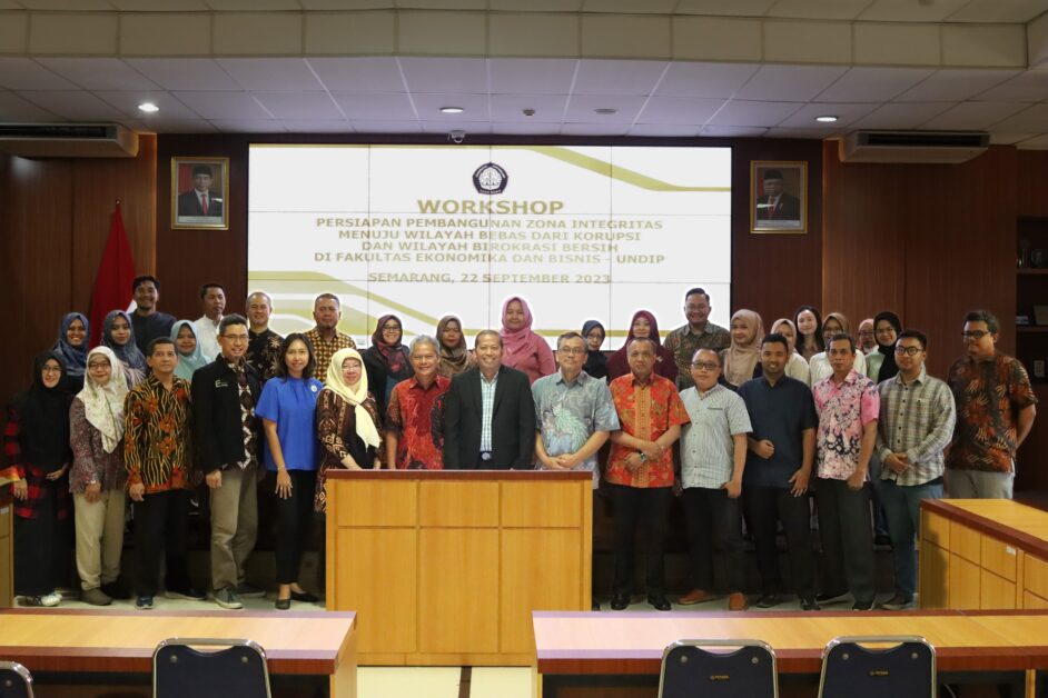 Semarang, 22 September 2023 – Fakultas Ekonomika dan Bisnis Universitas Diponegoro (FEB Undip) menggelar Workshop Persiapan Pembangunan Zona Integritas Wilayah Bebas dari Korupsi (ZI-WBK) sebagai lanjutan dari kegiatan serupa yang pernah diadakan sebelumnya pada tanggal 21 Juli 2023. Acara ini berlangsung di Ruang Sidang Utama Dekanat FEB Undip dan dihadiri oleh Tim Kerja ZI-WBK FEB Undip. Dekan FEB Undip, Prof. Suharnomo dalam sambutannya menekankan pentingnya integritas dalam dunia pendidikan, serta tujuan diadakannya workshop ini nantinya dapat memberikan gambaran yang diperlukan untuk memperlancar persiapan FEB Undip dalam meraih predikat zona integritas wilayah bebas dari korupsi (ZI WBK). Narasumber pada workshop kali ini terdiri dari 5 orang manager dari tiap Pengungkit yang berasal dari Tim ZI-WBK Fakultas Teknik Universita Diponegoro (FT UNDIP), yang dimana sebelumnya FT UNDIP sudah lebih dulu menyandang predikat ZI-WBK. Adapun kelima narasumber tersebut, yaitu; Manajer Pengungkit 1 : Dr. Naniek Utami Handayani, S.Si., MT., (Departemen Teknik Industri) Manajer Pengungkit 2 : Dr. Ir. Budi Prasetyo Samadikun, S.T., M.Si., IPM., ASEAN Eng. (Departemen Teknik Lingkungan) Manajer Pengungkit 4 : Mada Sophianingrum , S.T., M.T., MSc. (Departemen Perencanaan Wilayah dan Kota) Manajer Pengungkit 5 : Dr. Anak Agung Sagung Manik Mahachandra Jayanthi Mertha, S.T., M.Sc. (Departemen Teknik Industri) Manajer Pengungkit 6 : Dr. Yasser Wahyuddin, ST., MT., M.Sc (Departemen Teknik Geodesi) Adapun topik yang dibawakan oleh kelima pengungkit tersebut yaitu ; Pengungkit 1 mengenai Manajemen Perubahan, Pengungkit 2 mengenai Penataan Tata Laksana, Pengungkit 4 mengenai Penguatan Akuntabilitas Kinerja, Pengungkit 5 mengenai Penguatan Pengawasan, dan pengungkit 6 mengenai Peningkatan Kualitas Pelayanan. Dengan telah diadakannya Workshop pada tiap pengungkit ZI WBK, diharapkan akan memberikan dampak positif dalam mengimplementasikan prinsip Zona Integritas di lingkungan FEB Undip. Sehingga dalam waktu dekat FEB Undip akan semakin lancar dalam mengukuhkan diri sebagai salah satu kampus dengan predikat ZI-WBK.