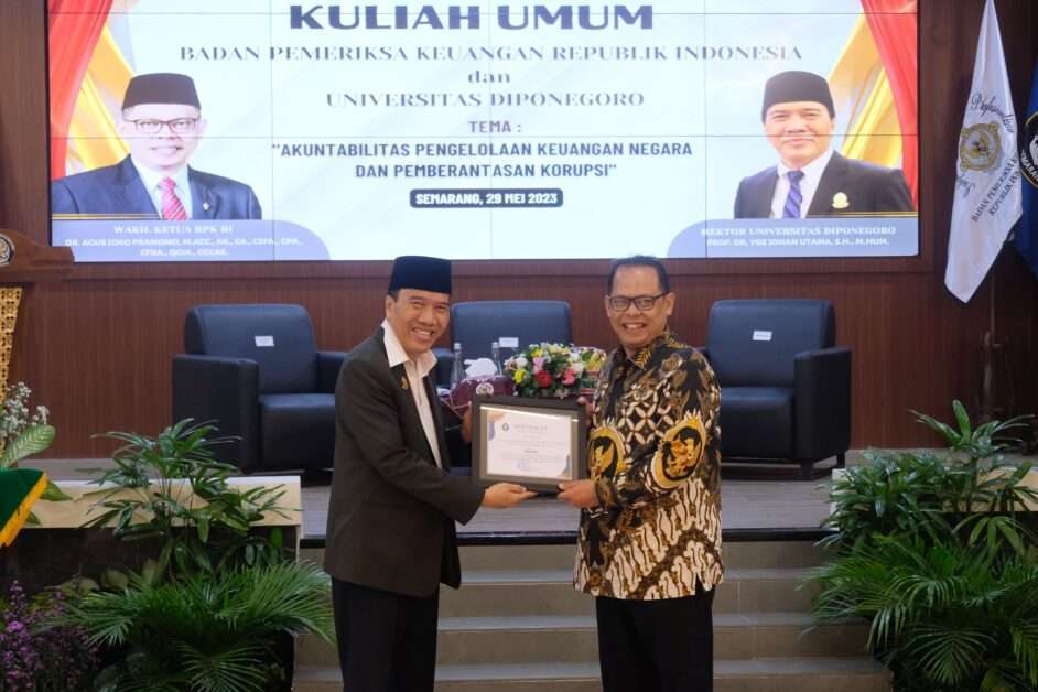 Univeritas Diponegoro (Undip) bersama dengan Badan Pemeriksa Keuangan Negara Republik Indonesia (BPK RI) telah menyelenggarakan kuliah umum yang bertemakan “Akuntabilitas Pengelolaan Keuangan Negara dan Pemberantasan Korupsi” pada Senin, 29 Mei 2023. Kegiatan yang dilaksanakan di Hall Gedung KWU Fakultas Ekonomika dan Bisnis (FEB) Undip ini, dihadiri oleh Prof. Dr. Yos Johan Utama, S.H., M.Hum. selaku Rektor Universitas Diponegoro, Dekan Fakultas Hukum Universitas Diponegoro (Prof. Dr. Retno Saraswati, S.H., M.Hum.), dan Dekan Fakultas Ekonomika dan Bisnis Universitas Diponegoro (Prof. Dr. Suharnomo, S.E., M.Si.) Dalam sambutan awal oleh Prof. Dr. Yos Johan Utama, S.H., M.Hum., disampaikan bahwa “Beliau sangat menyayangkan mengenai masalah akuntabilitas yang rata-rata bersumber pada ilmu hukum, dan itu merupakan bidang yang dikuasainya. Oleh karenanya kita agar berhati-hati dengan ilmu hukum kita.” Memasuki pada inti acara adalah pemaparan narasumber utama yakni Agus Joko Pramono, M.Acc., Ak., CA., CSFA., CPA., CFrA., QGIA., CGCAE. Beliau adalah Wakil Ketua BPK RI. Dalam paparannya, juga memberikan pengalaman dan pemahaman beliau mengenai Badan Pemeriksa Keuangan terutama perihal akuntabilitas pengelolaan keuangan negara di Indonesia. Adapun narasumber kedua yakni Dekan Sekolah Pascasarjana Undip, Dr. R.B. Sularto, SH, M.Hum., yang mengangkat materi mengenai pemberantasan korupsi melalui kaca mata ilmu hukum. Dari kuliah umum ini diharapkan peserta dapat memiliki wawasan dan pedoman mengenai peran BPK RI dalam pencegahan tindak pidana korupsi, dan bersama melakukan rekomendasi-rekomendasi guna memperbaiki sistem keuangan negara yang ada di Indonesia melalui kasus-kasus yang telah dibahas.