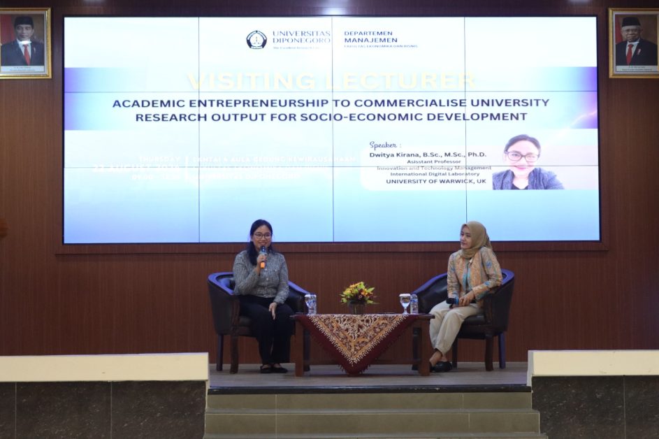 Semarang, 22 Agustus 2024 – Departemen Manajemen Fakultas Ekonomika dan Bisnis Universitas Diponegoro (FEB Undip) menggelar acara Visiting Professor bertajuk “Academic Entrepreneurship to Commercialize University Research Output for Socio-Economic Development” pada Kamis, 22 Agustus 2024, di Hall Gedung Kewirausahaan FEB Undip. Acara ini menghadirkan Dr. Dwitya Kirana, B.Sc., M.Sc., Ph.D., seorang akademisi sekaligus entrepreneur, yang juga menjabat sebagai Assistant Professor Innovation and Technology Management di International Digital Laboratory, University of Warwick, Inggris. Dalam sambutannya Dekan FEB Undip yakni, Prof. Faisal, menyampaikan rasa senang dan bangganya akan kegiatan ini. Beliau yakin kegiatan ini dapat memberikan manfaat yang besar tidak bagi akademisi yang ada di FEB Undip tetapi dapat meningkatkan reputasi yang baik bagi institusi kami. Dalam kuliahnya, Dr. Dwitya menekankan pentingnya kewirausahaan akademik sebagai jalan untuk mengkomersialisasikan hasil riset universitas demi mendukung pengembangan sosio-ekonomi masyarakat. Ia memaparkan empat agenda utama yang perlu dikuasai peserta untuk menjadi akademisi sekaligus entrepreneur. Pertama, Dr. Dwitya membahas mengenai konsep akademik entrepreneurship. Kedua, ia menyoroti pentingnya inovasi berbasis masyarakat dan bagaimana universitas dapat mewujudkan ide-ide tersebut. Agenda ketiga berfokus pada temuan penelitian terkait inovasi di Indonesia, dan yang terakhir, ia menekankan pentingnya tindakan konkret dalam mengimplementasikan inovasi tersebut. “Dunia industri sangat penting untuk menciptakan dampak nyata dari hasil riset universitas. Enterpreneurship tidak hanya tentang menjadi pebisnis, tetapi juga mencakup proses, pengetahuan, dan keterampilan,” ujar Dr. Dwitya. Ia juga membagikan beberapa strategi yang dapat diterapkan oleh universitas untuk mendorong kewirausahaan akademik, seperti peningkatan kolaborasi dan penciptaan lingkungan ekosistem yang mendukung. Acara yang dihadiri oleh Dekan FEB Undip, dosen, dan mahasiswa Program Studi Manajemen FEB Undip, turut hadir juga seorang entrepreneur muda yakni Chacha Frederica (Wynne Frederica, S.E., BBA.) hal ini diharapkan dapat menginspirasi akademisi Undip untuk lebih aktif dalam dunia entrepreneurship, sehingga hasil penelitian mereka dapat memberikan kontribusi signifikan bagi pengembangan sosio-ekonomi, baik di tingkat lokal maupun nasional. Kegiatan ini juga bertujuan memperkaya wawasan dan memperkuat jaringan internasional.
