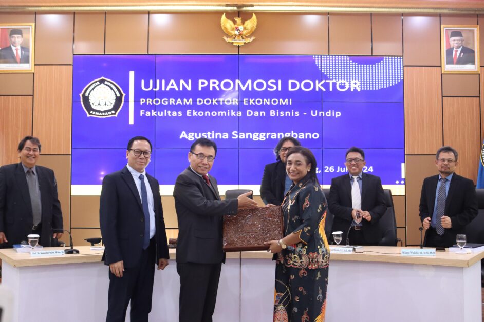 Semarang, 26 Juli 2024, Program Doktor Ilmu Ekonomi Fakultas Ekonomika dan Bisnis Universitas Diponegoro (PDIE FEB Undip) menyelenggarakan ujian promosi doktor untuk Agustina Sanggrangbano, guna mempertahankan disertasinya berjudul “Konvergensi Pembangunan Ekonomi: Daerah Kabupaten/Kota Pada Lima Wilayah Adat Di Provinsi Papua”. Promosi doktor ini diadakan di Ruang Pertamina FEB Undip. Agustina Sanggrangbano, seorang putri asli Papua dan dosen tetap di FEB Universitas Cenderawasih Jayapura, aktif dalam berbagai organisasi ilmiah. Beliau adalah peneliti di Pusat Kajian Ekonomi dan Keuangan Daerah Uncen serta di Center for Economic Development Inclusion and Poverty Alleviation of Papua Studies (CEdPS) Uncen. Dalam disertasinya, Agustina bertujuan untuk menganalisis dampak variabel pendidikan dan ketergantungan spasial terhadap konvergensi ekonomi daerah kabupaten/kota di Provinsi Papua. Penelitian ini menggunakan data panel dari 29 kabupaten/kota yang terbagi dalam lima wilayah adat (Mamta, Saireri, Meepago, Lapago, dan Anim-Ha) selama periode 2013-2021. Hasil penelitian menunjukkan bahwa variabel pendidikan, yang diukur melalui belanja pendidikan dari transfer pusat, belanja pendidikan dari dana otonomi khusus, siswa afirmasi Papua, dan siswa SMA di Papua, berdampak terhadap konvergensi ekonomi daerah kabupaten/kota di Papua sesuai dengan teori pertumbuhan ekonomi MRW. Selain itu, ketergantungan spasial terbukti memiliki pengaruh signifikan dalam mendukung konvergensi ekonomi daerah tersebut. Secara keseluruhan, karya Agustina Sanggrangbano merupakan bukti dedikasi terhadap pembangunan daerahnya (Papua) yang menghadapi tantangan geografis dan topografis dalam hal aksesibilitas dan mobilitas. Adapun untuk Komite Ujian terdiri dari Prof. Faisal, S.E., M.Si., Ph.D. (Ketua Sidang Ujian), Prof. Firmansyah, S.E., M.Si., Ph.D. (Promotor), Prof. Dr. FX. Sugiyanto, M.S. (Penguji), Prof. Dr. Samsubar Saleh, M.Soc.Sc. (Penguji), Akhmad Syakir Kurnia, SE, M.Si. Ph.D (Penguji) dan Wahyu Widodo, SE, M.Si. Ph.D (Penguji). Ujian berlangsung selama dua jam dan promovenda mampu mempertahankan disertasinya sehingga dinyatakan lulus oleh Komite Ujian dan berhak menyandang gelar Doktor. Selamat dan Semoga sukses dalam berkarya.