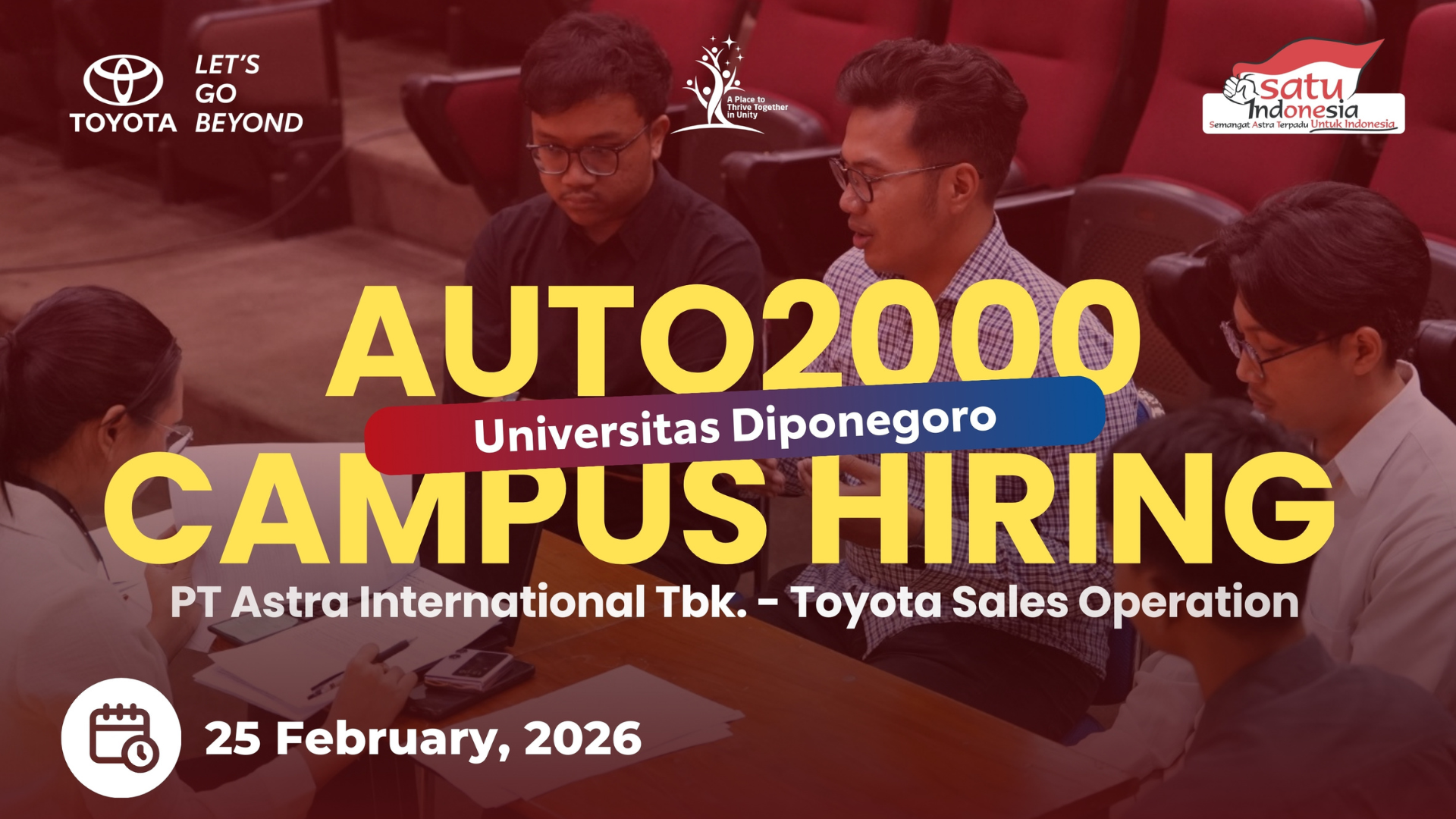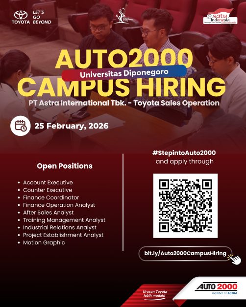 Universitas Diponegoro kembali menjadi tuan rumah kegiatan rekrutmen perusahaan nasional melalui program campus hiring yang diselenggarakan oleh PT Astra International Tbk. – Toyota Sales Operation (AUTO2000). Kegiatan ini akan dilaksanakan pada 25 Februari 2026 dan menjadi bagian dari upaya mempertemukan dunia industri dengan talenta muda potensial dari lingkungan kampus.
