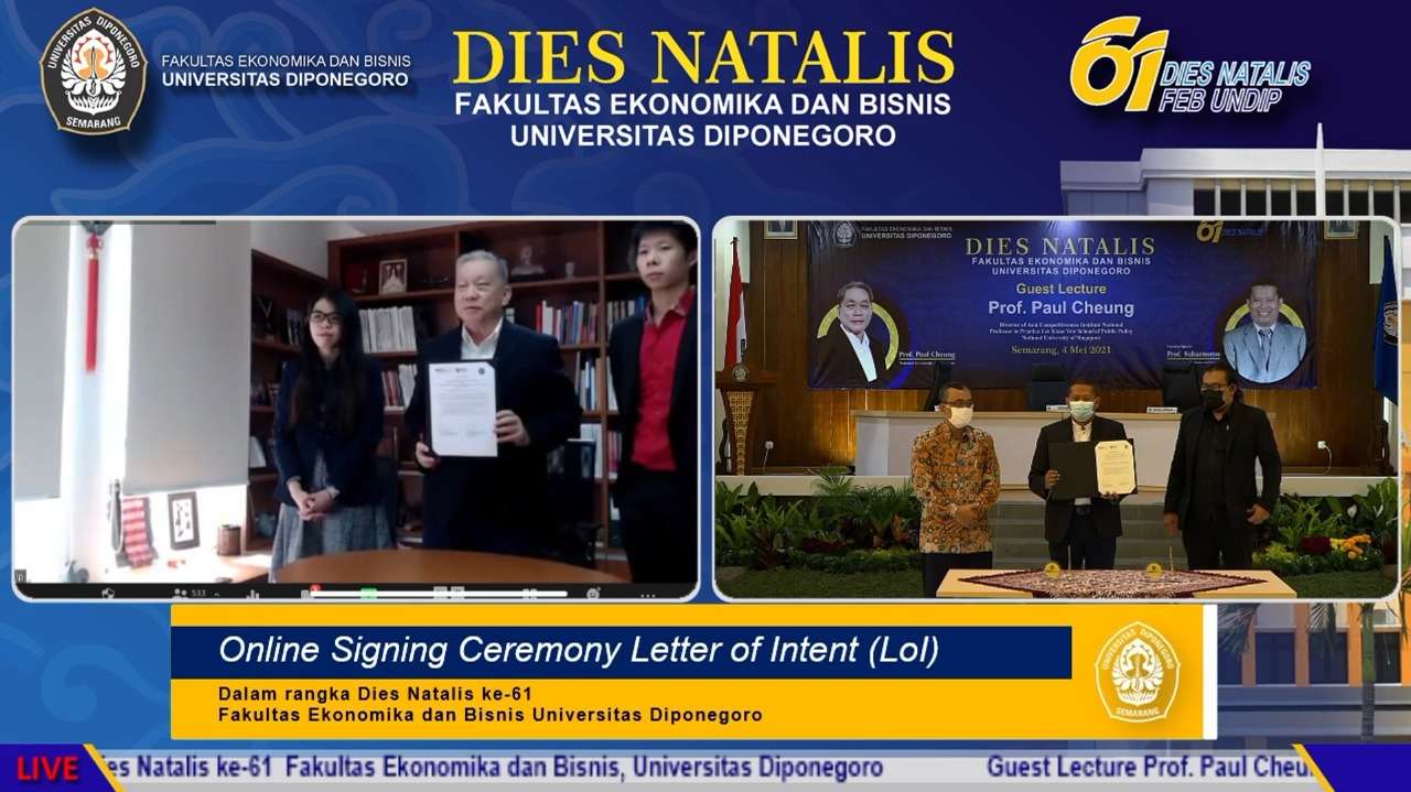 Universitas Diponegoro (Undip) sebagai salah satu universitas terbaik di Indonesia bekerja sama dengan National University of Singapore yang merupakan universitas dengan peringkat ke-11 terbaik di dunia berdasarkan QS World University Rankings 2020-2021. Acara penandatanganan Kerjasama ini dilaksanakan pada Selasa, 4 Mei 2021 secara online (daring) dengan tempat di Fakultas Ekonomika dan Bisnis Universitas Diponegoro dan National University of Singapore. Penandatanganan tersebut dilakukan oleh Prof. Dr. Suharnomo, S.E., M.Si selaku Dekan Fakultas Ekonomika dan Bisnis Universitas Diponegoro dan Prof. Paul Cheung selaku Director of Asia Competitiveness Institute, Lee Kuan Yew School of Public Policy National University of Singapore. Setelah itu acara dilanjutkan dengan Guest Lecture oleh Prof. Paul Cheung dengan tema “Measuring Competitiveness in The Field of Human Resource: Asia Competitiveness Institute Approach”. Acara tersebut merupakan salah satu rangkaian acara dalam Dies Natalis ke-61 Fakultas Ekonomika dan Bisnis Universitas Diponegoro dan dihadiri oleh lebih dari 550 peserta yang merupakan akademisi, peneliti, mahasiswa serta alumni Fakultas Ekonomika dan Bisnis Universitas Diponegoro.