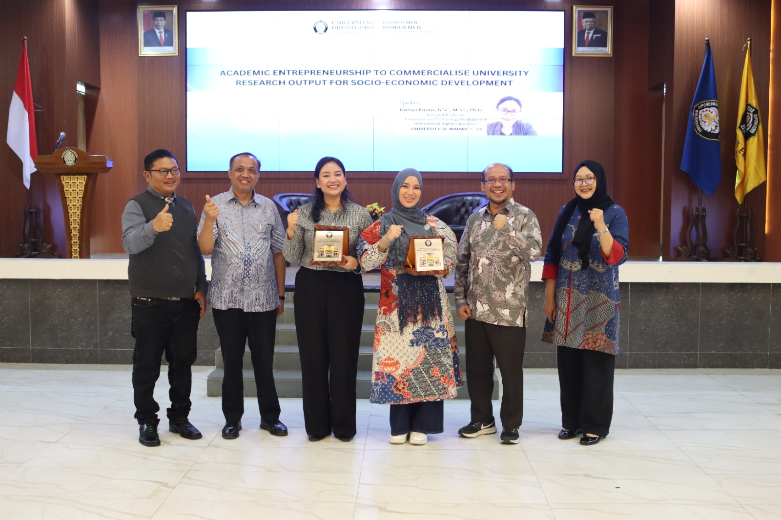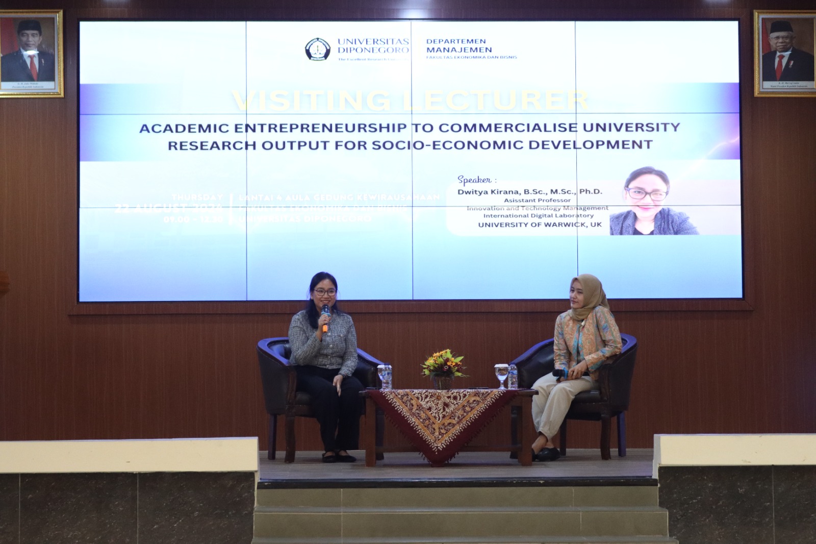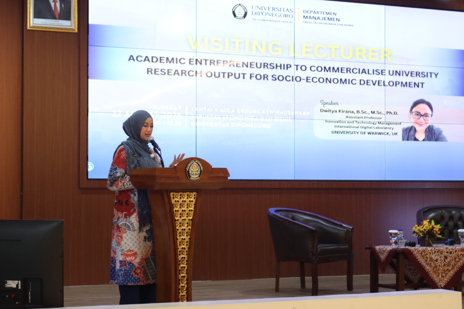 Semarang, 22 Agustus 2024 – Departemen Manajemen Fakultas Ekonomika dan Bisnis Universitas Diponegoro (FEB Undip) menggelar acara Visiting Professor bertajuk “Academic Entrepreneurship to Commercialize University Research Output for Socio-Economic Development” pada Kamis, 22 Agustus 2024, di Hall Gedung Kewirausahaan FEB Undip. Acara ini menghadirkan Dr. Dwitya Kirana, B.Sc., M.Sc., Ph.D., seorang akademisi sekaligus entrepreneur, yang juga menjabat sebagai Assistant Professor Innovation and Technology Management di International Digital Laboratory, University of Warwick, Inggris.