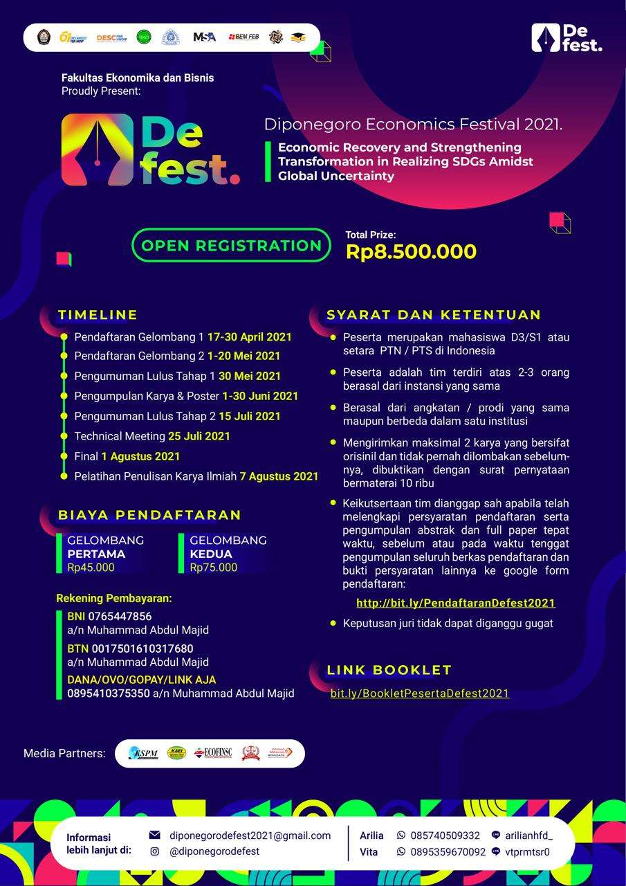 Based on this, in order to welcome the 61st Anniversary, the Faculty of Economics and Business, Diponegoro University presents a mini research competition which has the aim of making students sensitive to issues and problems that exist in Indonesia. Therefore, the Faculty of Economics and Business, Diponegoro University through the Student Executive Board of the Faculty of Economics and Business held the DEFEST (Diponegoro Economic Festival) event.