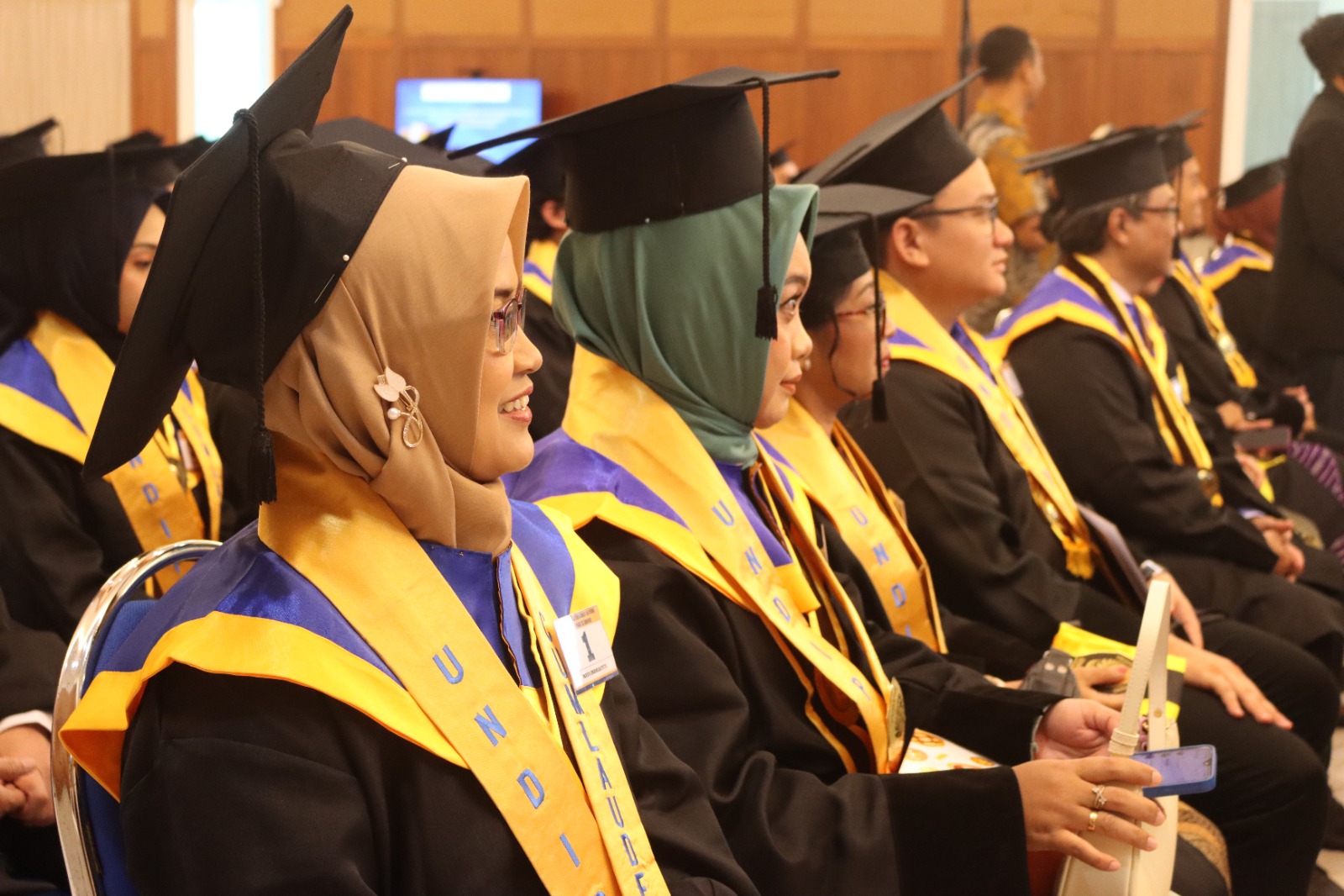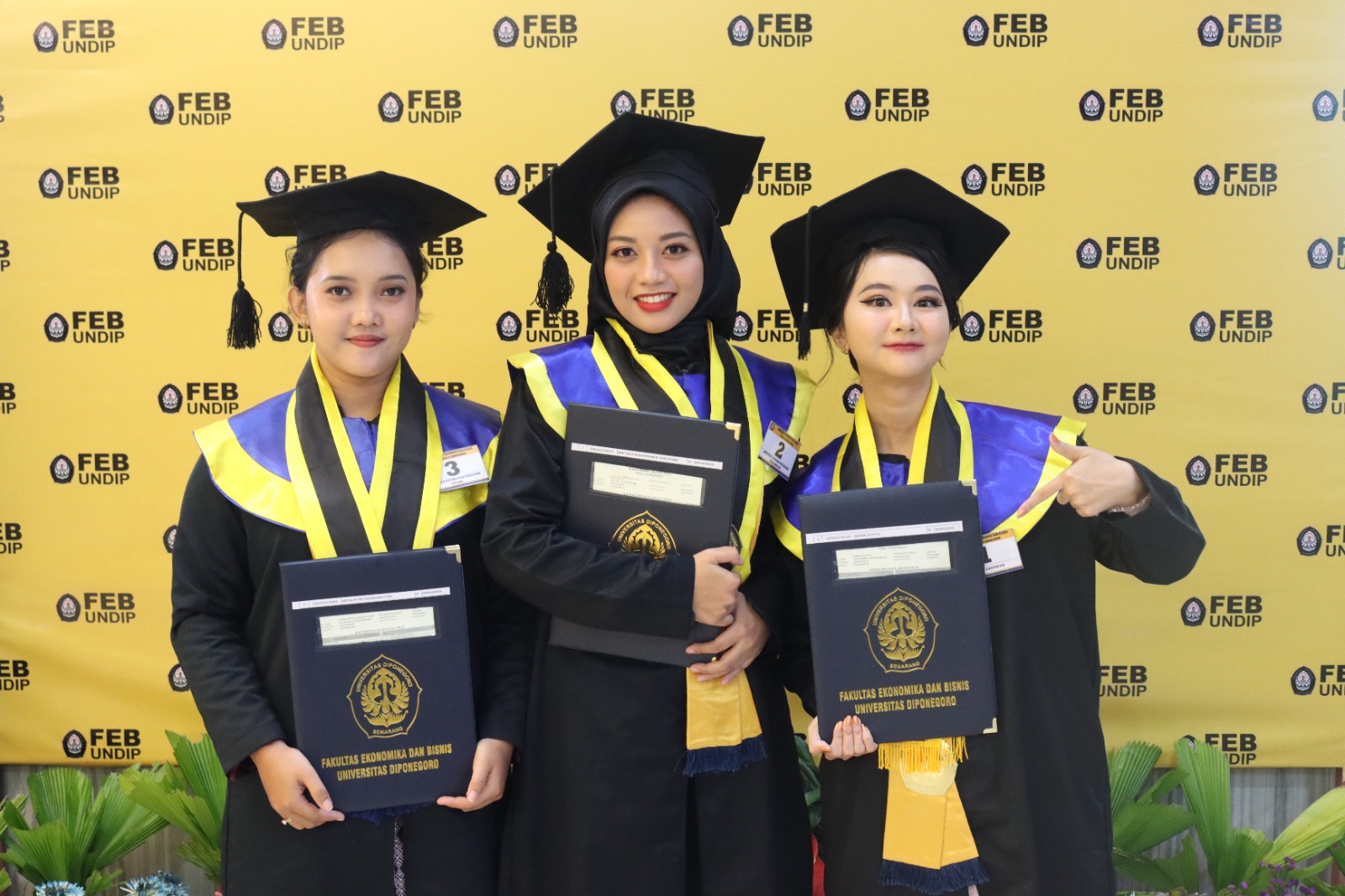 Acara dimulai dengan menyanyikan lagu kebangsaan “Indonesia Raya,” kemudian dilanjutkan dengan pengumuman prestasi mahasiswa terbaik oleh Wakil Dekan Bidang Akademik dan Kemahasiswaan FEB Undip, Prof. Firmansyah. Lulusan terbaik dari program S1 di antaranya adalah Widya Lesticya dari Manajemen dengan IPK 3,92, Addien Safriya Ramadhani dari Akuntansi yang berhasil meraih IPK sempurna 4,00, Ida Musrifah dari Ekonomi Islam dengan IPK 3,87, dan Axel Azriel Alfarizqy dari Ekonomi dengan IPK 3,82. Selain itu, ada tiga lulusan yang berhasil meraih dua gelar sarjana melalui program Double Degree dengan universitas mitra luar negeri. Susanti Kisworowati Adiningtyas memperoleh gelar Sarjana dari Universitas Diponegoro dan Saxion University of Applied Sciences (Belanda), sedangkan Liana Novani Putri dan Vernanda Djibril Dewanty mendapatkan gelar Sarjana dari Universitas Diponegoro dan Medicis Business School (Prancis).