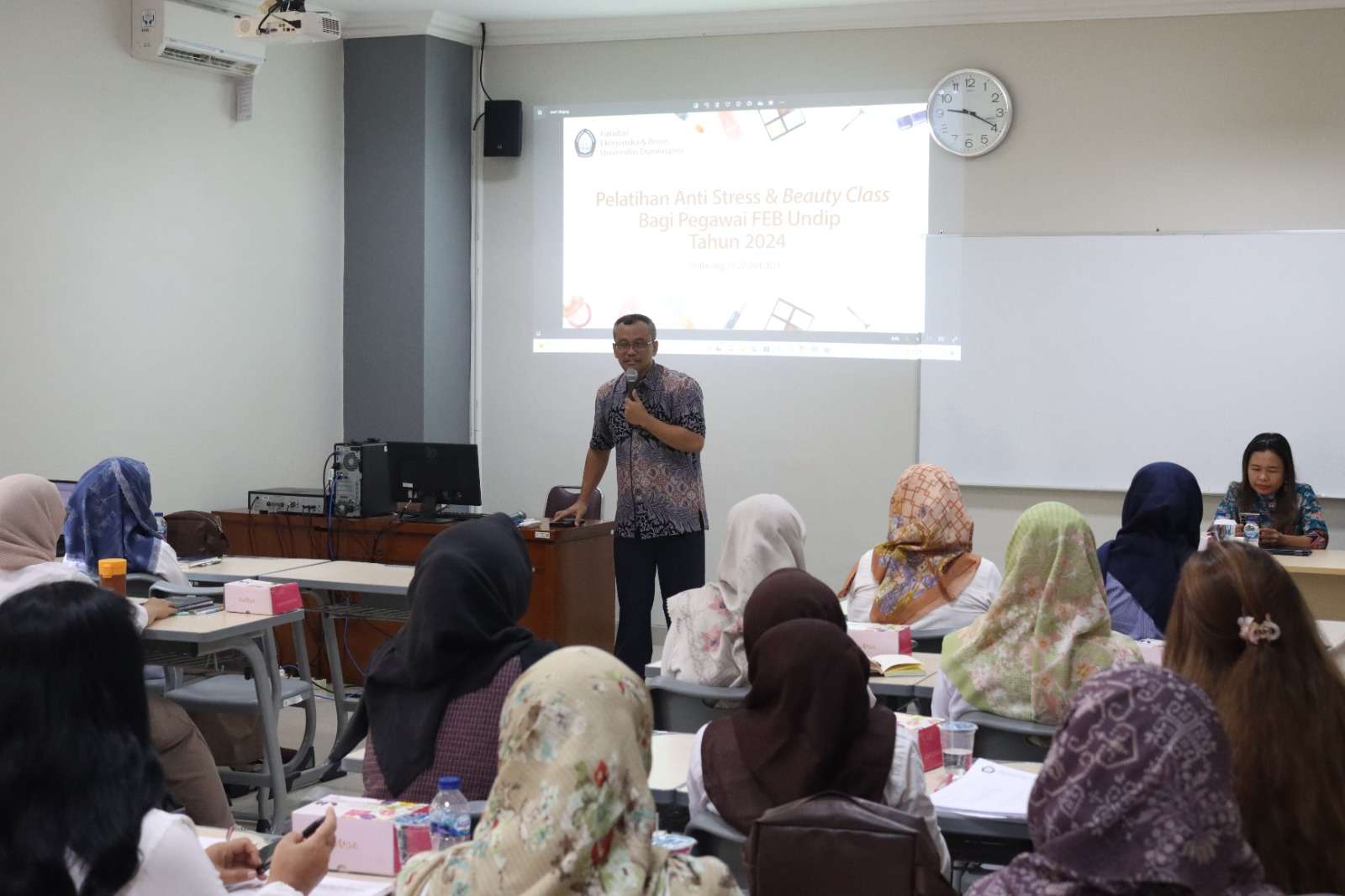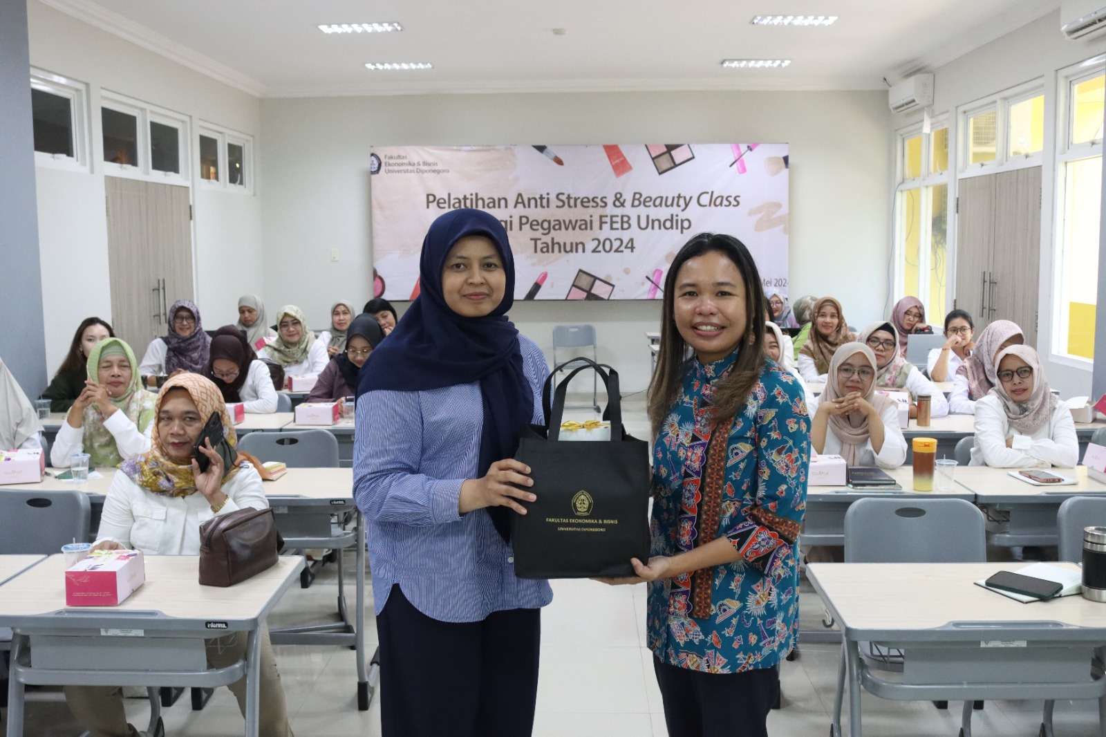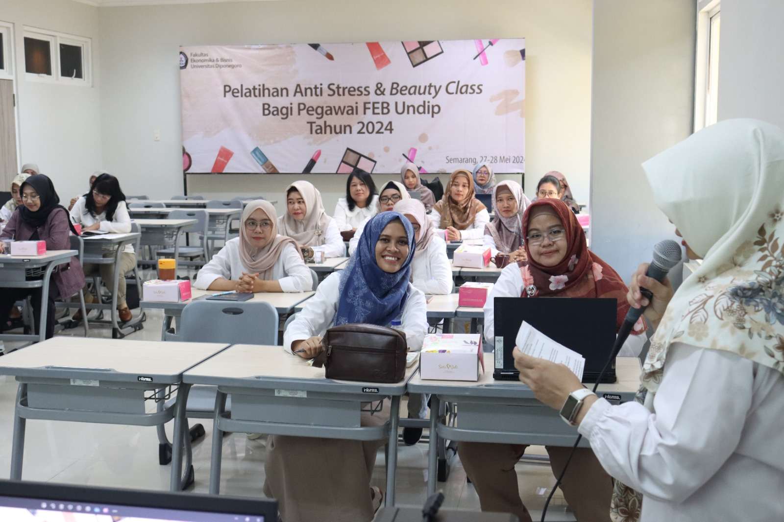 Fakultas Ekonomika dan Bisnis Universitas Diponegoro (FEB Undip) mengadakan pelatihan beauty class pada 27-28 Mei 2024 di Gedung KWU FEB Undip. Kegiatan ini bertujuan untuk meningkatkan kualitas pelayanan prima, terutama dalam hal penampilan profesional dan manajemen stres di tempat kerja.