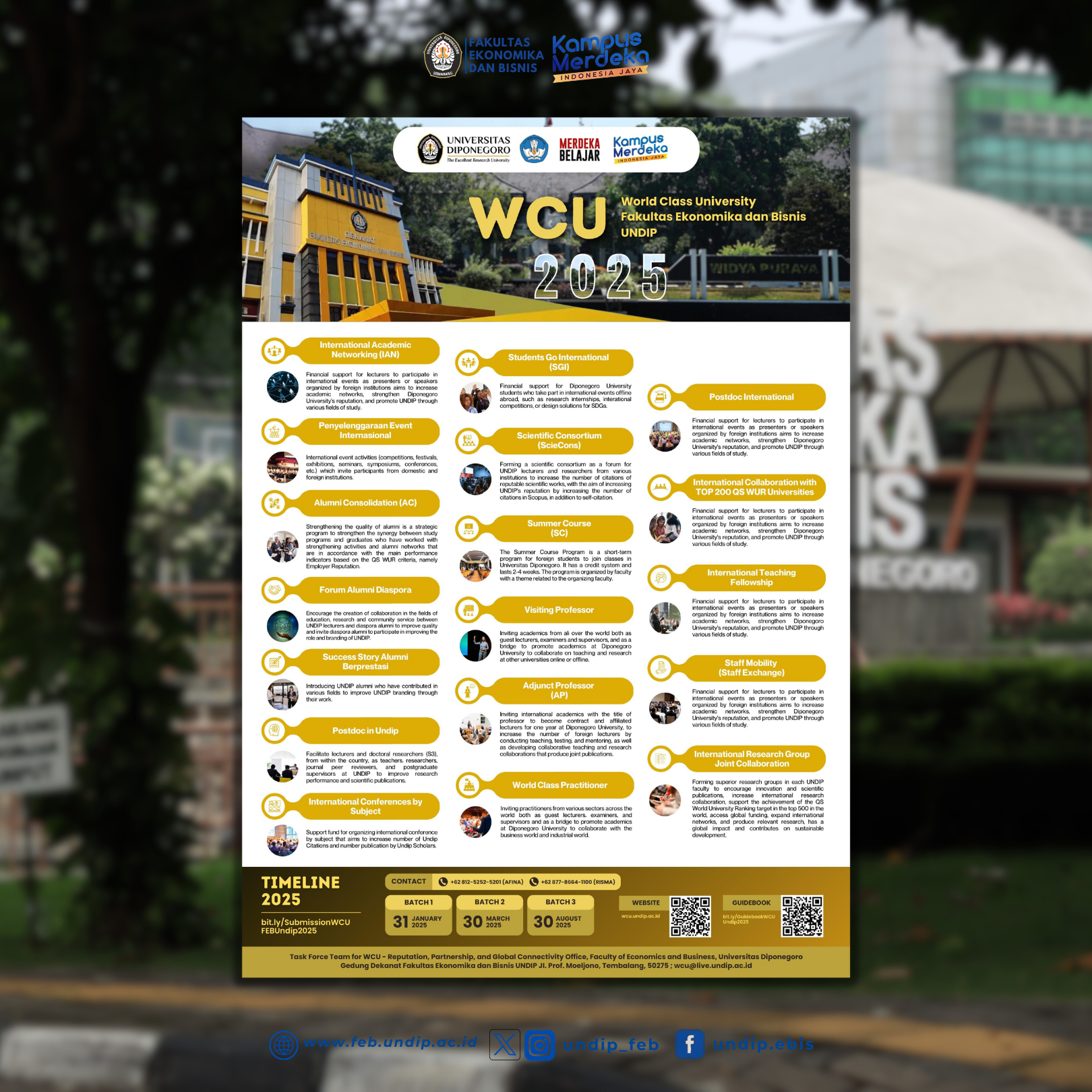 Fakultas Ekonomika dan Bisnis Universitas Diponegoro (FEB UNDIP) terus berupaya meningkatkan kualitas dan reputasi internasional melalui program World Class University (WCU). Program ini dirancang untuk mendukung civitas akademika FEB UNDIP dalam mengembangkan jaringan global, meningkatkan kolaborasi internasional, serta mempromosikan keunggulan akademik dan penelitian di kancah dunia.