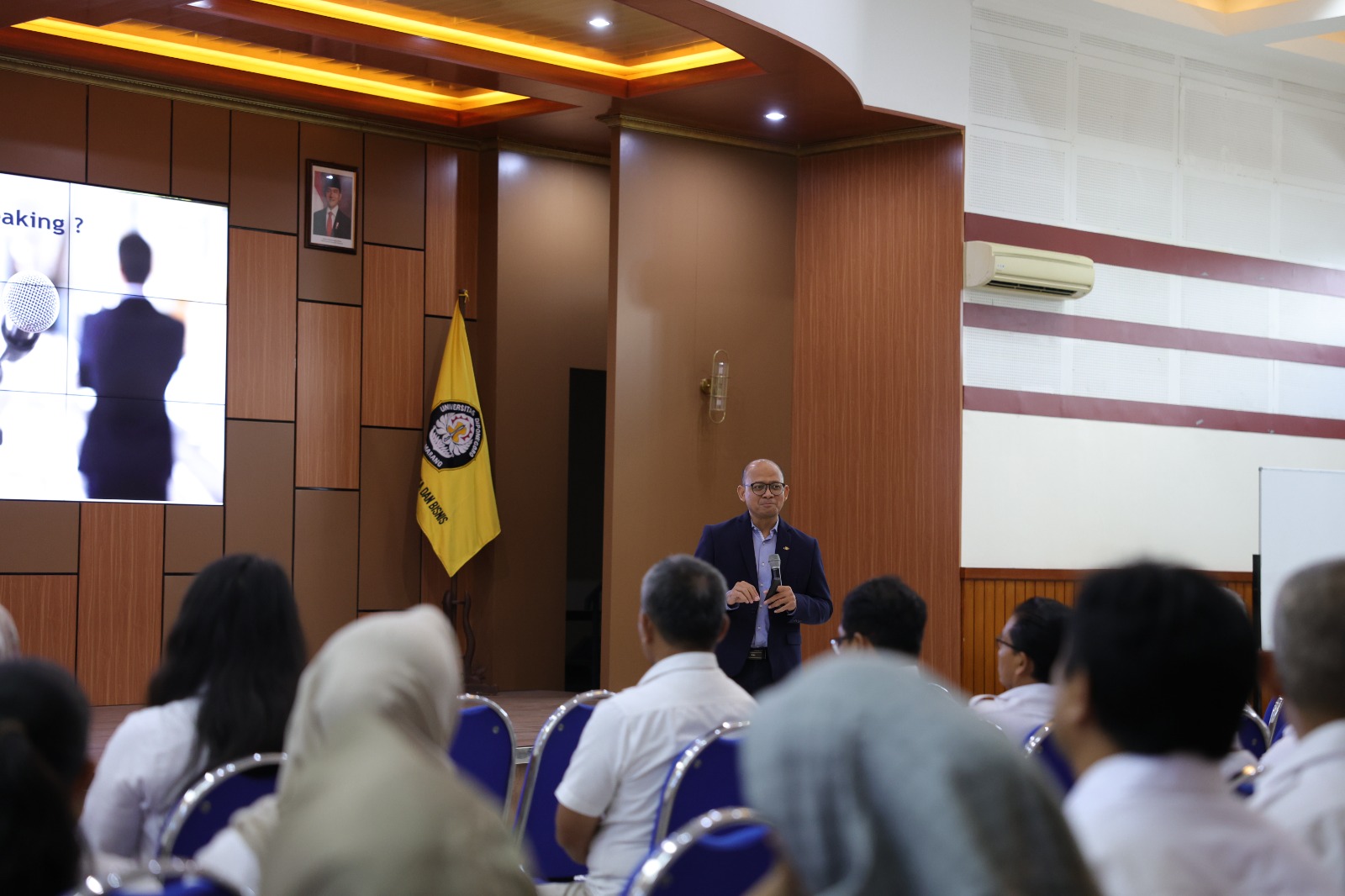 Pelatihan ini dilaksanakan untuk merespons tantangan pekerjaan yang semakin kompleks, meningkatnya beban layanan, serta tuntutan pelayanan prima kepada mahasiswa, dosen, dan pemangku kepentingan lainnya. Kemampuan berbicara di depan publik secara efektif menjadi kompetensi penting bagi tenaga kependidikan, khususnya dalam menyampaikan informasi, membangun kepercayaan, serta menciptakan komunikasi yang profesional dan beretika. Dalam sambutannya, Wakil Dekan Bidang Sumber Daya FEB Undip, Dr. Wahyu Meiranto, S.E., Akt., M.Si., menekankan pentingnya penguatan keterampilan komunikasi sebagai bagian dari peningkatan kualitas layanan fakultas.