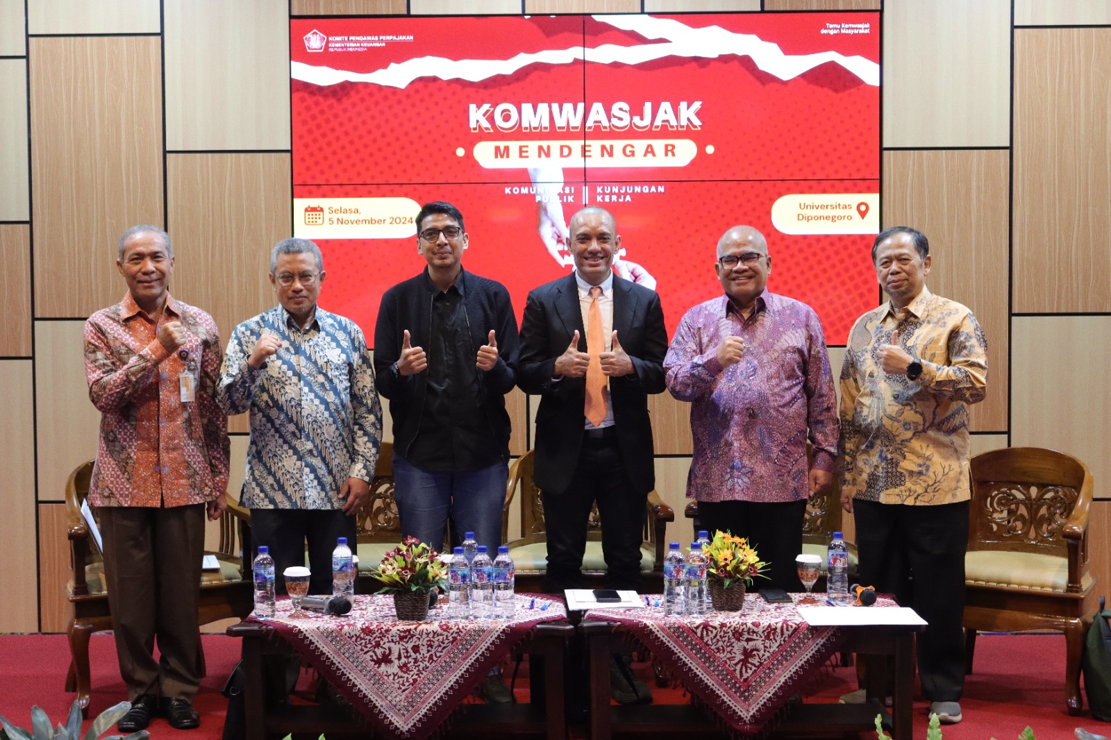 Semarang, 5 November 2024 — Komite Pengawas Perpajakan (Komwasjak) menutup rangkaian komunikasi publik tahun 2024 dengan kegiatan “Komwasjak Mendengar” yang diadakan di Universitas Diponegoro, Semarang. Kegiatan yang berlangsung di Hall Gedung C, FEB Undip, ini memberi ruang bagi masyarakat Jawa Tengah untuk memberikan saran, masukan, dan aspirasi terkait kebijakan