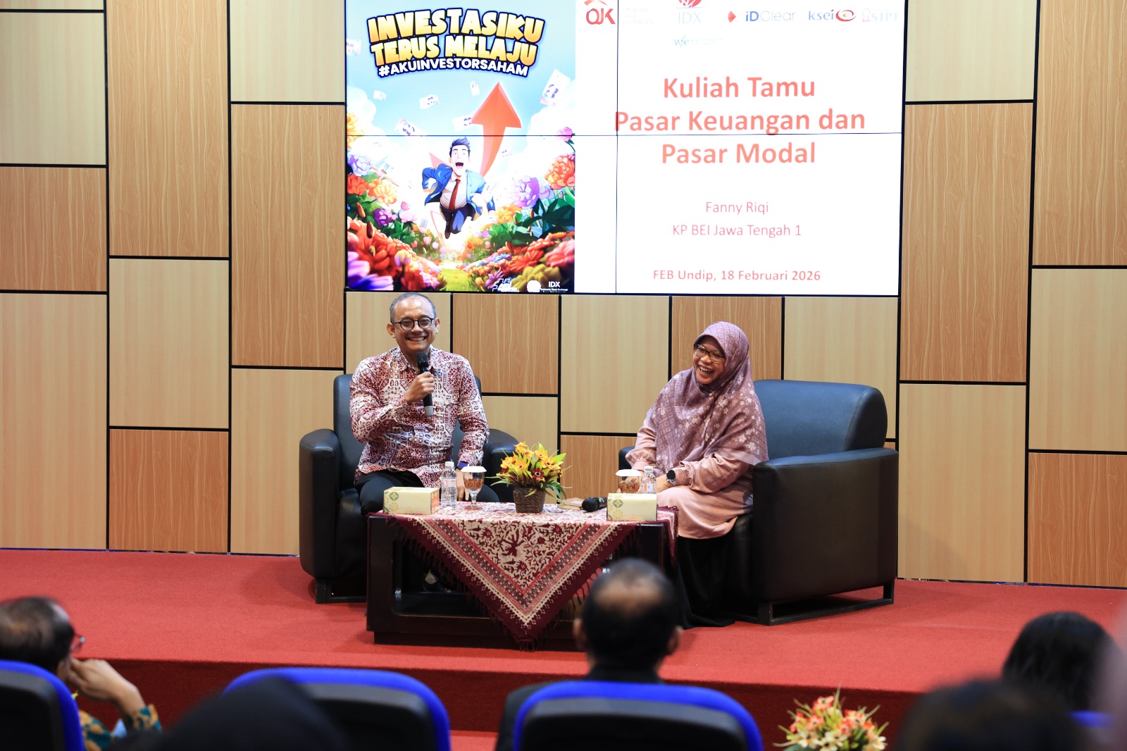 Materi disampaikan oleh Fanny Rifqi El Fuad, Kepala Kantor Perwakilan Bursa Efek Indonesia Jawa Tengah 1, dan dimoderatori oleh Astiwi Indriani, S.E., M.M., Dosen Program Studi S1 Manajemen FEB Undip. Dalam pemaparannya, narasumber menjelaskan peran strategis pasar modal dalam mendukung pertumbuhan ekonomi nasional serta peluang investasi yang dapat dimanfaatkan mahasiswa secara rasional dan terukur.