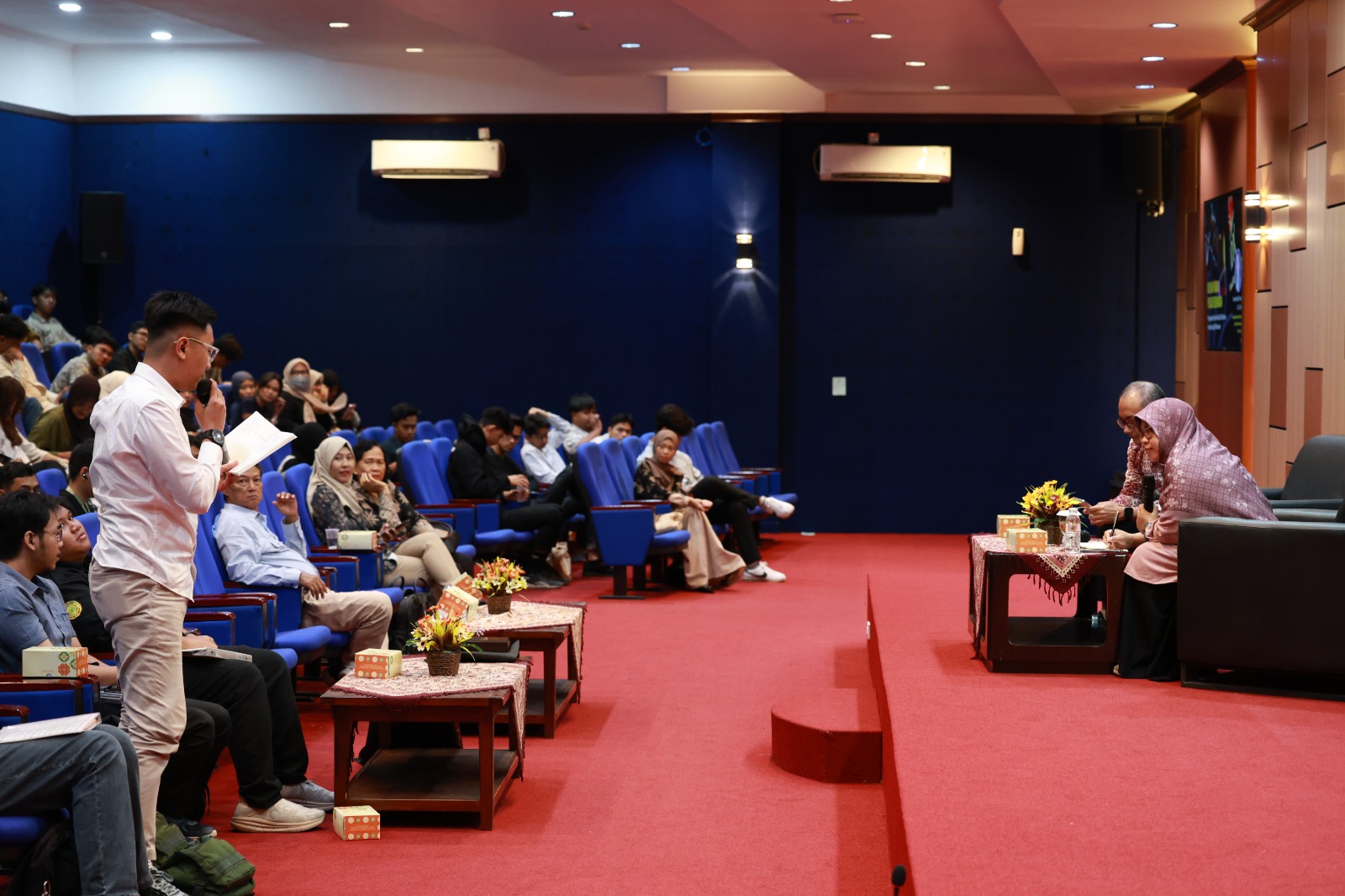 Sesi diskusi berlangsung interaktif. Salah satu mahasiswa mengajukan pertanyaan, “Apa saja fundamental yang harus dimiliki perusahaan agar layak melakukan Initial Public Offering (IPO)?”