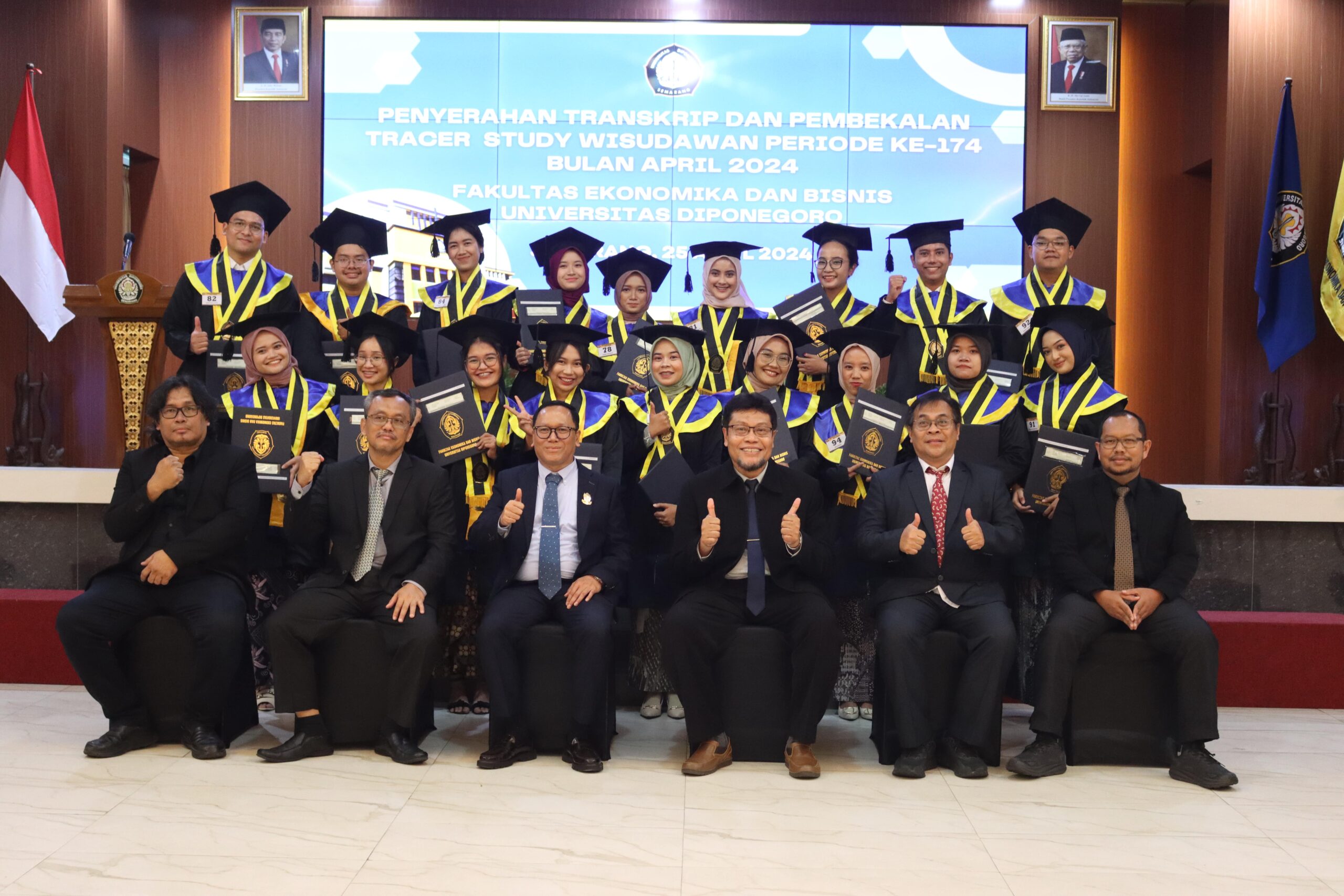 Semarang, 25 April 2024, sebanyak 236 mahasiswa dan mahasiswi yang meraih gelar Sarjana (S1), Magister (S2), dan Doktor (S3) dari Fakultas Ekonomika dan Bisnis Universitas Diponegoro telah mengikuti Prosesi Penyerahan Transkrip dan Pembekalan Tracer Study bagi wisudawan periode ke-174. Kegiatan ini berlangsung di Hall Gedung Laboratorium Kewirausahaan FEB Undip dimulai pukul 14.00 WIB hingga selesai.