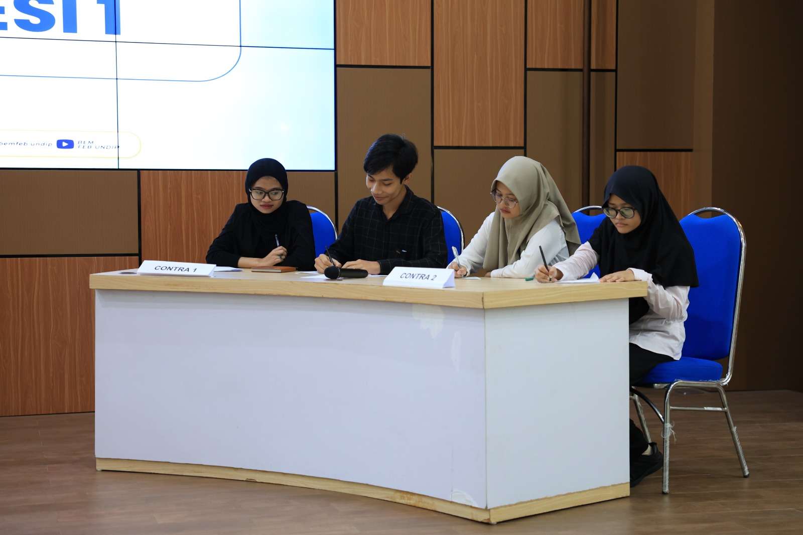 Fakultas Ekonomika dan Bisnis Universitas Diponegoro (FEB Undip) menyelenggarakan seleksi tingkat fakultas untuk Kompetisi Debat Mahasiswa Indonesia (KDMI) dan National Debate Competition University (NDCU) pada 7-8 Maret 2025. Kegiatan yang diinisiasi oleh Badan Eksekutif Mahasiswa (BEM) FEB Undip ini berlangsung di Ruang Hall Pertamina Dekanat FEB Undip pada hari pertama dan Ruang Promosi Doktor FEB Undip pada hari kedua.