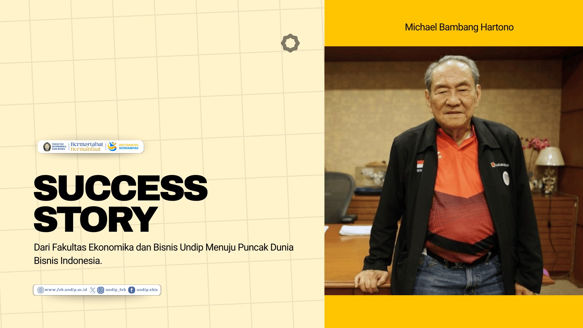 Fakultas Ekonomika dan Bisnis Universitas Diponegoro (FEB Undip) mencatat salah satu kisah inspiratif alumninya melalui sosok Michael Bambang Hartono, pengusaha nasional yang dikenal luas sebagai figur sentral dalam dunia bisnis Indonesia. Bersama sang kakak, Robert Budi Hartono, beliau membangun dan mengembangkan kelompok usaha besar yang bergerak di berbagai sektor strategis, mulai dari industri rokok, perbankan, teknologi, hingga properti. Perjalanan panjang tersebut bermula dari bangku kuliah di FEB Undip, Semarang.